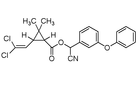 別名 氯氰菊酯 ;3-(2,2-二氯乙烯基)-2,2-二甲基環(huán)丙烷羧酸 alpha-氰基-3-苯氧基芐酯 ;Alphamethrine