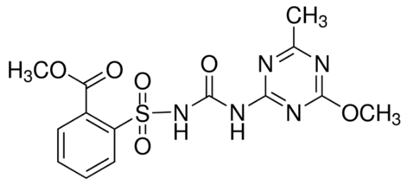 別名 甲磺隆 ;2-[3-(4-甲氧基-6-甲基-1,3,5-三嗪-2-基)脲基磺酰基]苯甲酸甲酯,2-[(4-甲氧基-6-甲基-1,3,5-三嗪基-2-基)脲基磺酰基]苯甲酸甲酯 ;